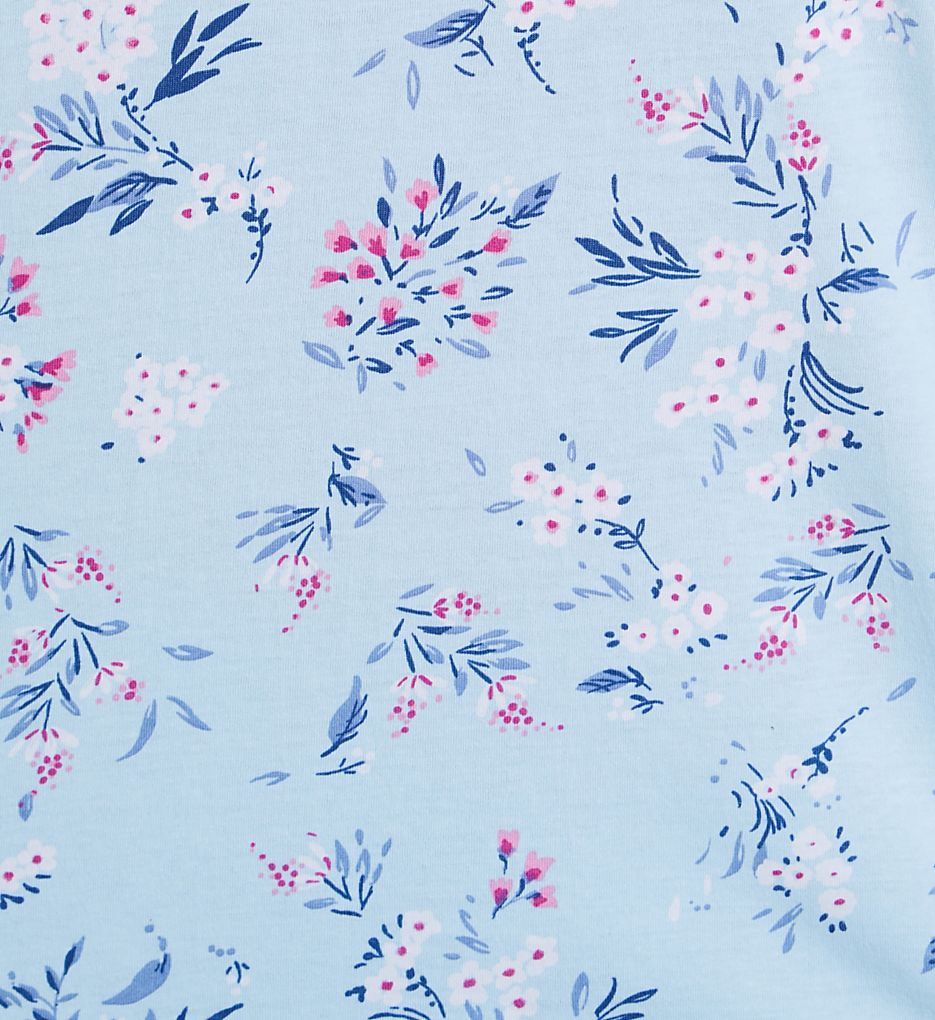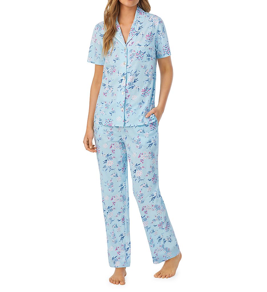 It'll feel like summer all year whenever you wear this floral print pajama set to bed. Includes notch collar top with short sleeves and drawstring pants. Made of knit pure cotton.