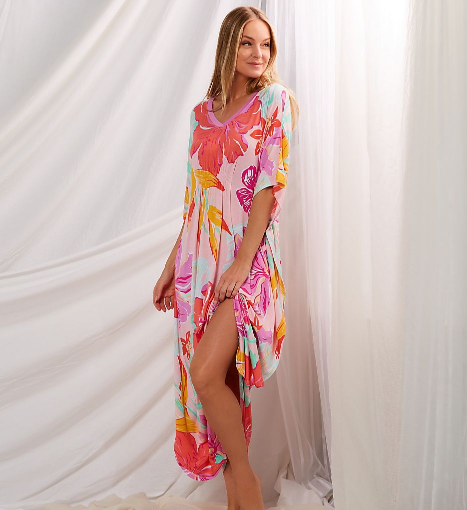 You'll dream of lounging in a tropical paradise whenever you slip into this tropical floral print caftan. Made of rayon and spandex.