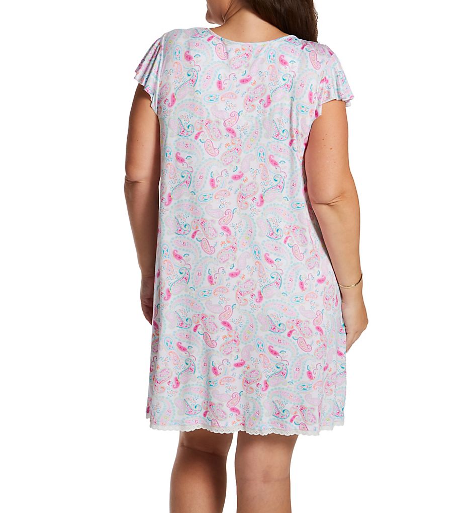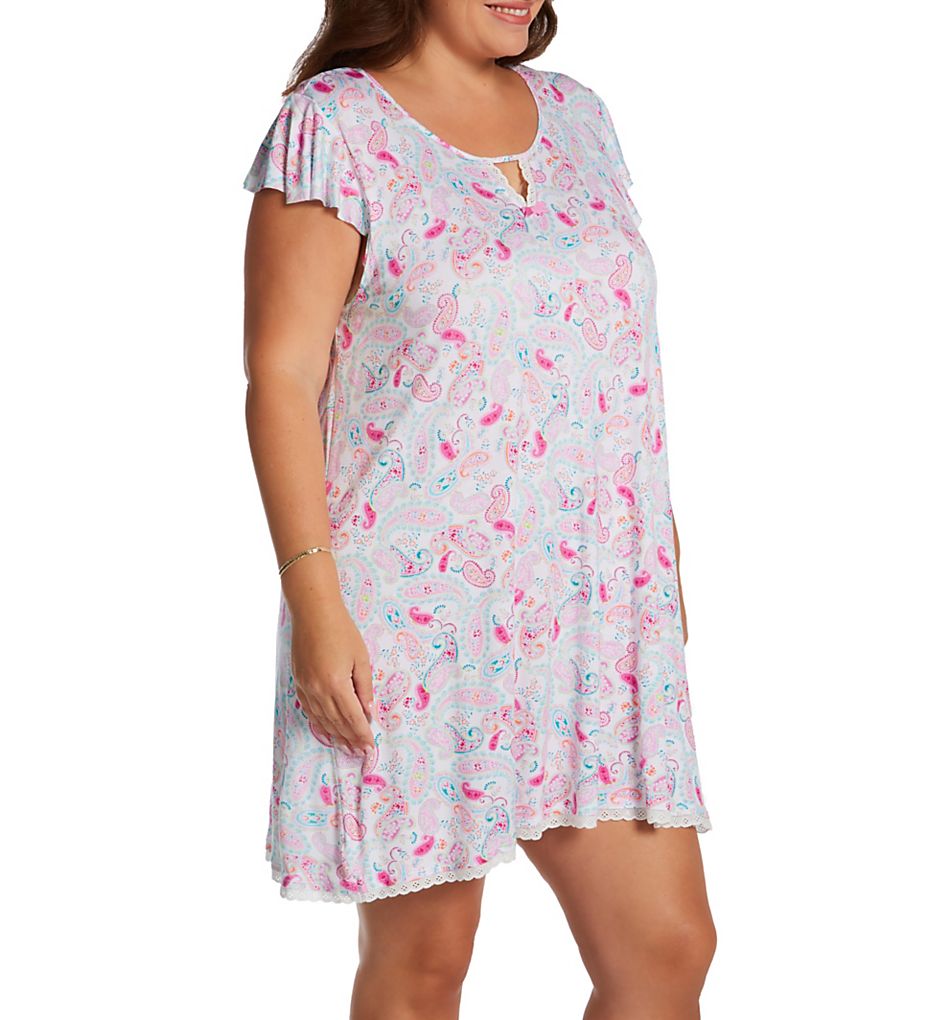 The Ellen Tracy Plus Size Paisley Flutter Sleeve Chemise N9025634 has a breathable knit body with a generous cut and short hem. Ellen Tracy's Plus Size Paisley Flutter Sleeve Chemise is made of rayon/spandex.