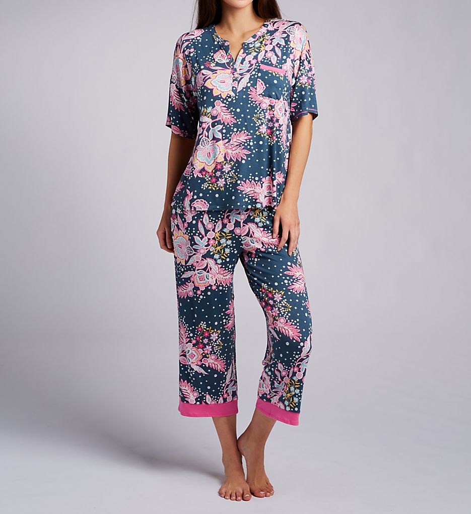 The Ellen Tracy Jersey Elbow Sleeve Cropped Wide Leg Pant PJ Set N8525649 is soft knit with high breathability and gives you a boxy cut top with above the ankle bottoms. Ellen Tracy's Jersey Elbow Sleeve Cropped Wide Leg Pant PJ Set is made of rayon/spandex.